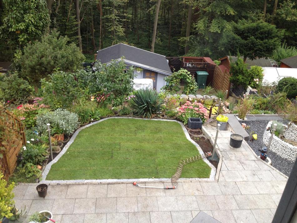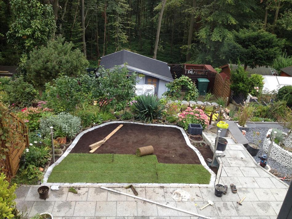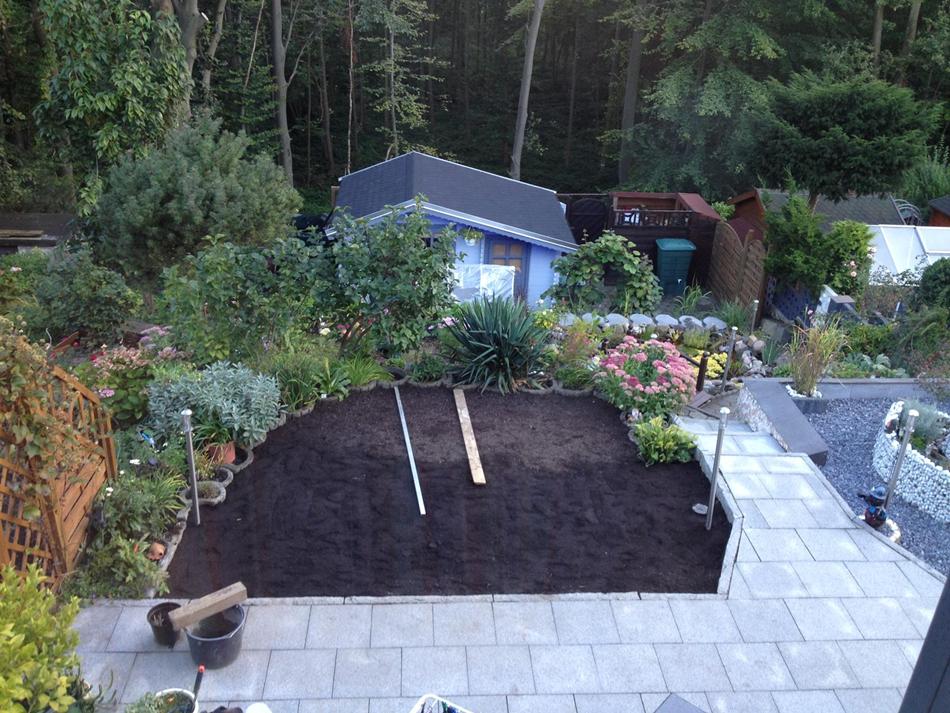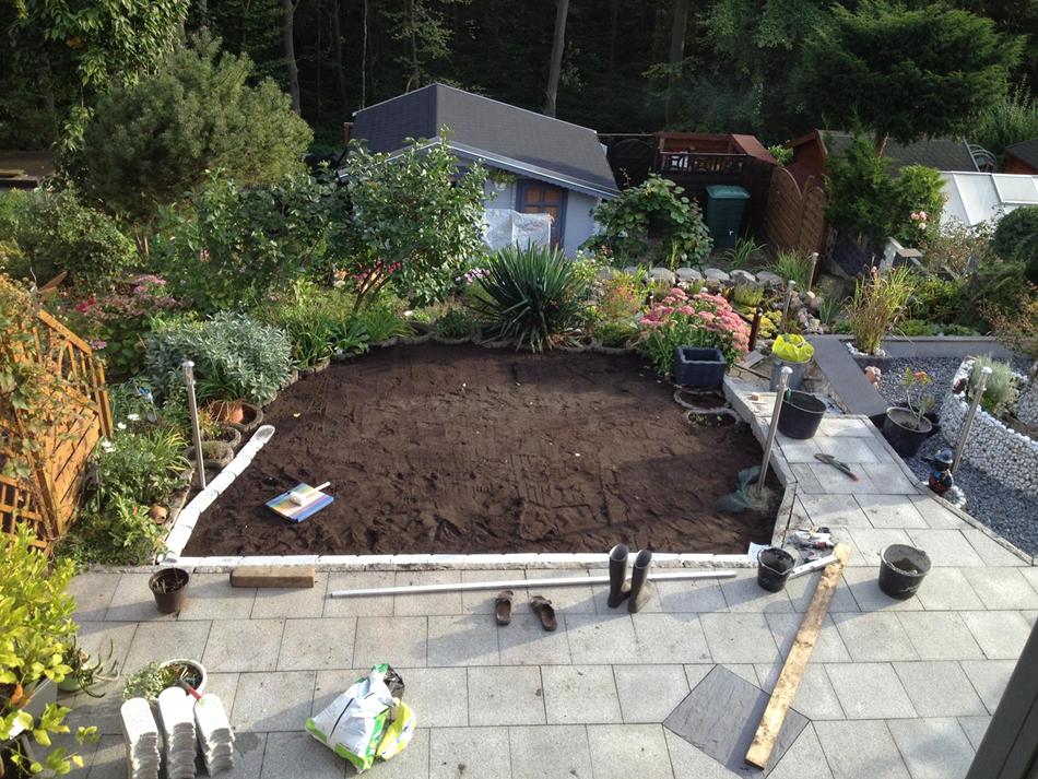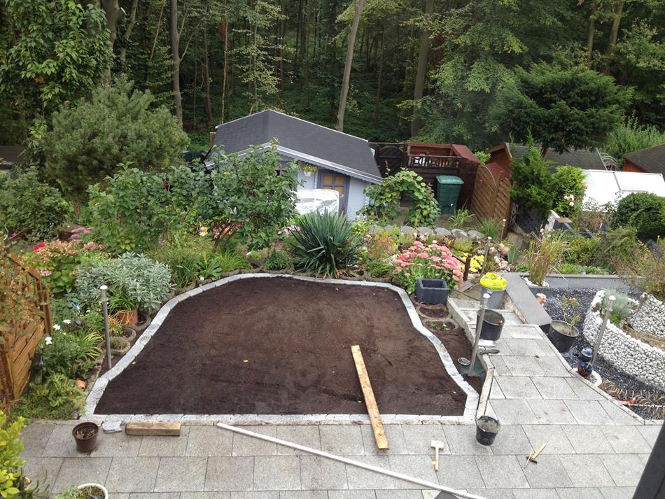 Jetzt den Rollrasen drauflegen und feststampfen. Ich hatte keine Walze also habe ich mit einem Balken gestampft.